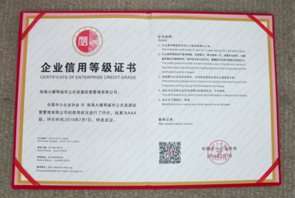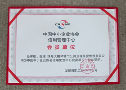 2016年7月1日,大橫琴城資公司順利通過了國家商務部信用等級評價,榮獲企業信用狀況AAA級的最高評級,并成為中國中小企業協會信用管理中心的會員單位。