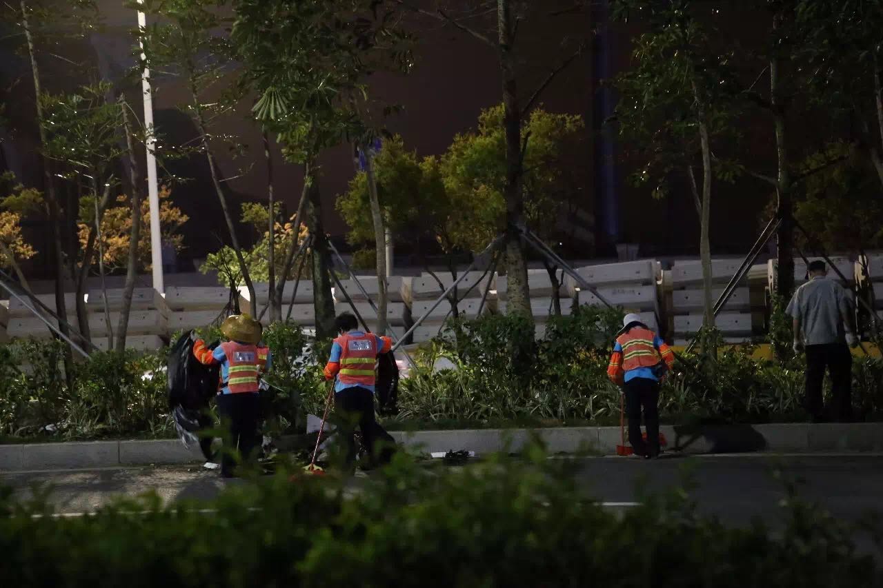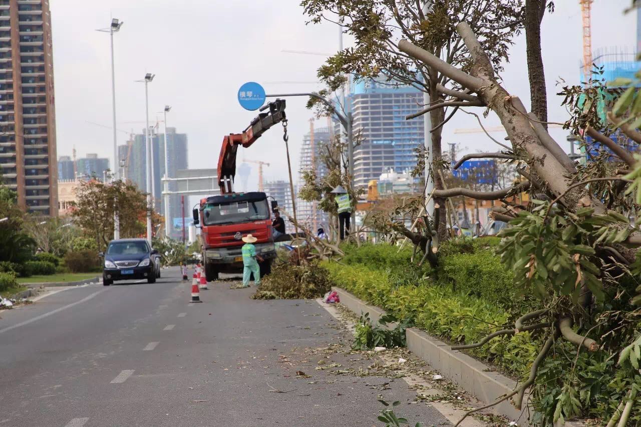 28日6時許,120余名城資員工,攜6臺吊機、2臺勾機,冒雨繼續(xù)在環(huán)島東路進行樹木扶正加固工作。28日7時許,90余名一線環(huán)衛(wèi)工人,攜6臺大貨車、4臺自卸車,冒雨集中對港澳大道、橫琴大道、中心大道的樹葉、白色垃圾進行淸理。