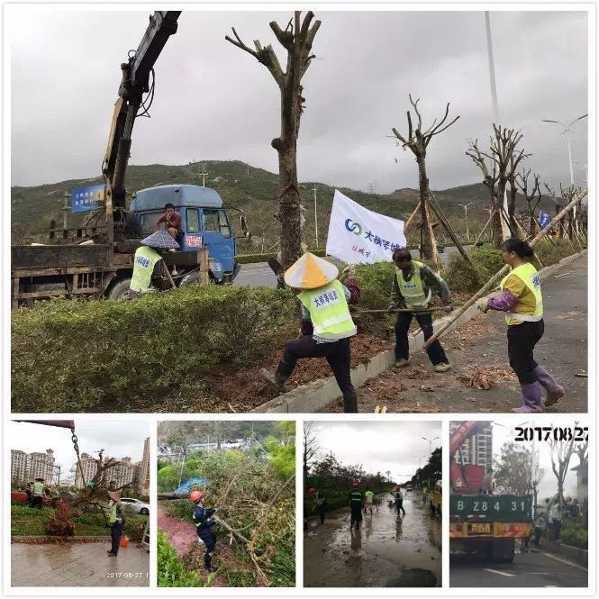 (我司員工冒雨對港澳大道、橫琴大道、中心大道扶樹、清理垃圾)