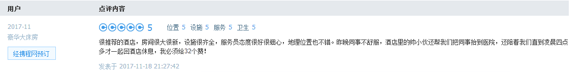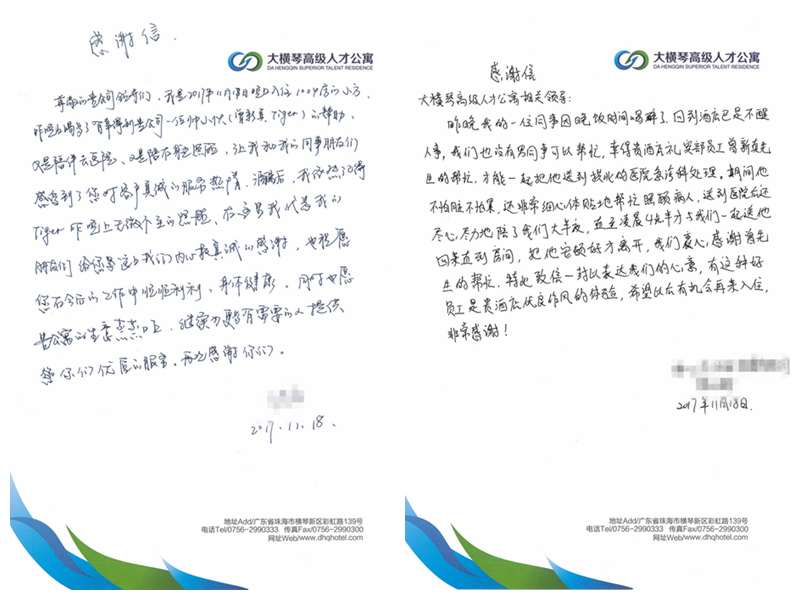 2017年11月18日,由我司負責經營的大橫琴高級人才公寓酒店再一次收到了住店客戶親筆寫下的感謝信。該客戶在信中詳述了酒店前廳部禮賓員曾新真,在客戶身體不適時,第一時間將客戶送至醫院就診并陪護至深夜,客戶對該員工的行為非常感動,并對酒店的服務質量贊譽有加。
