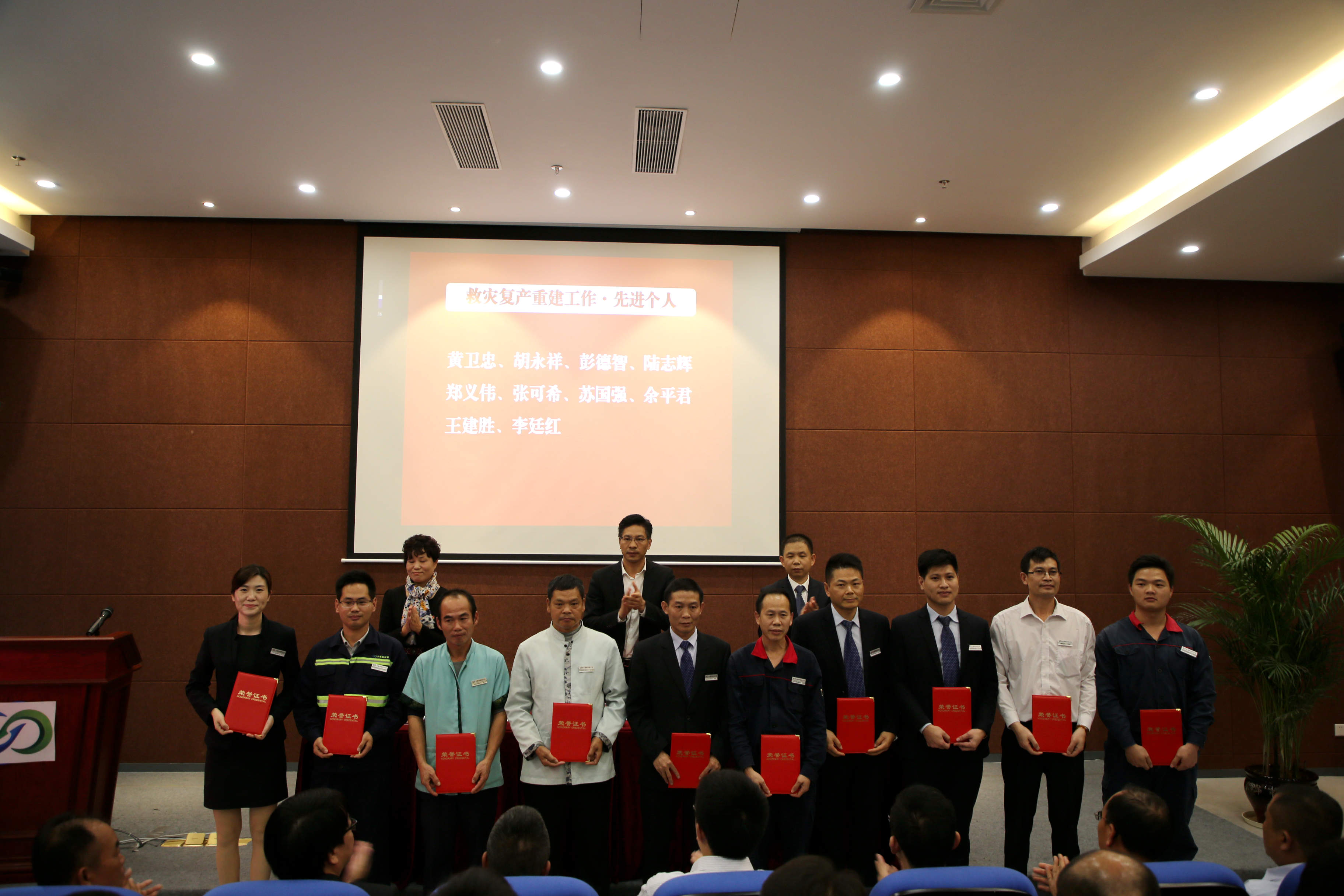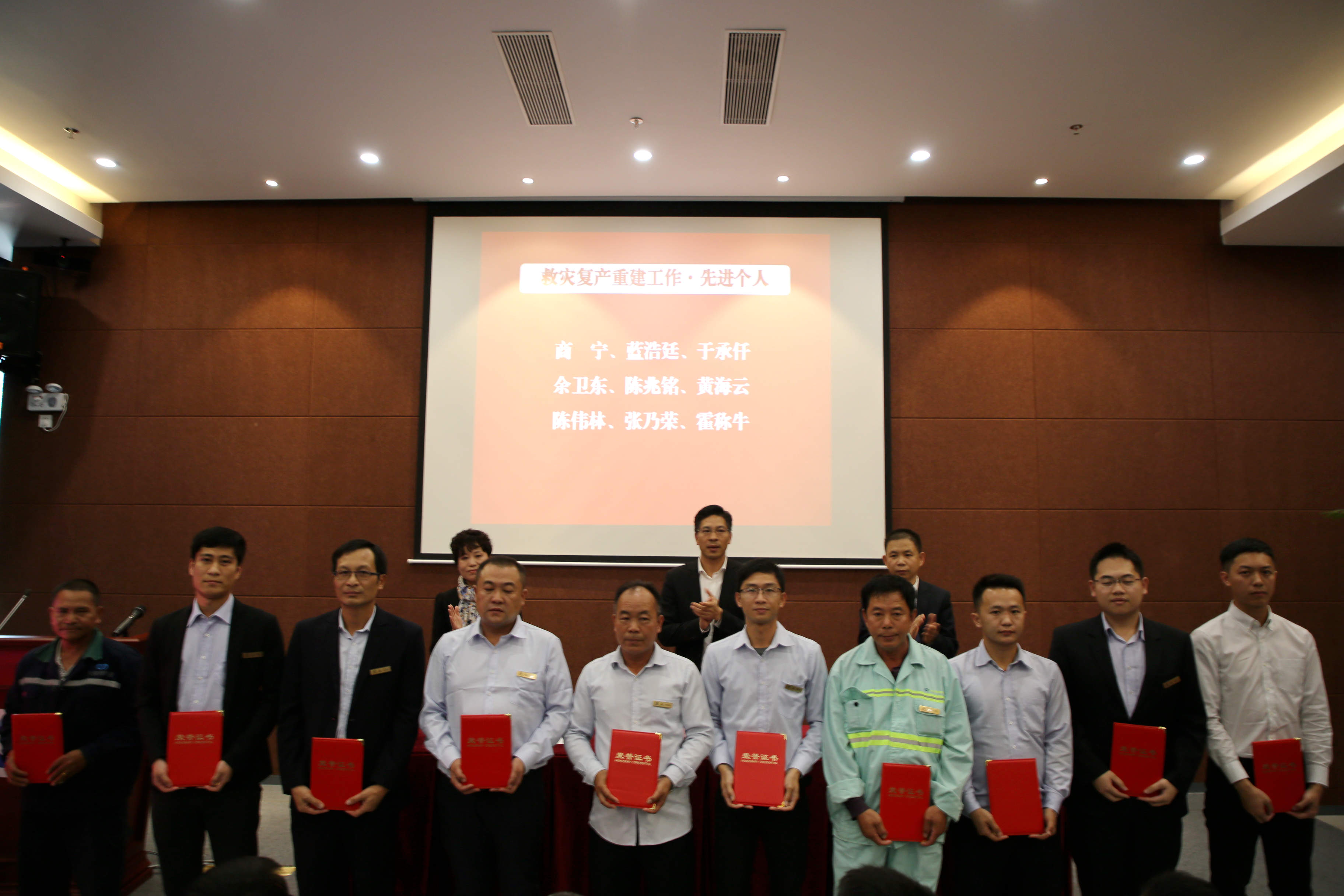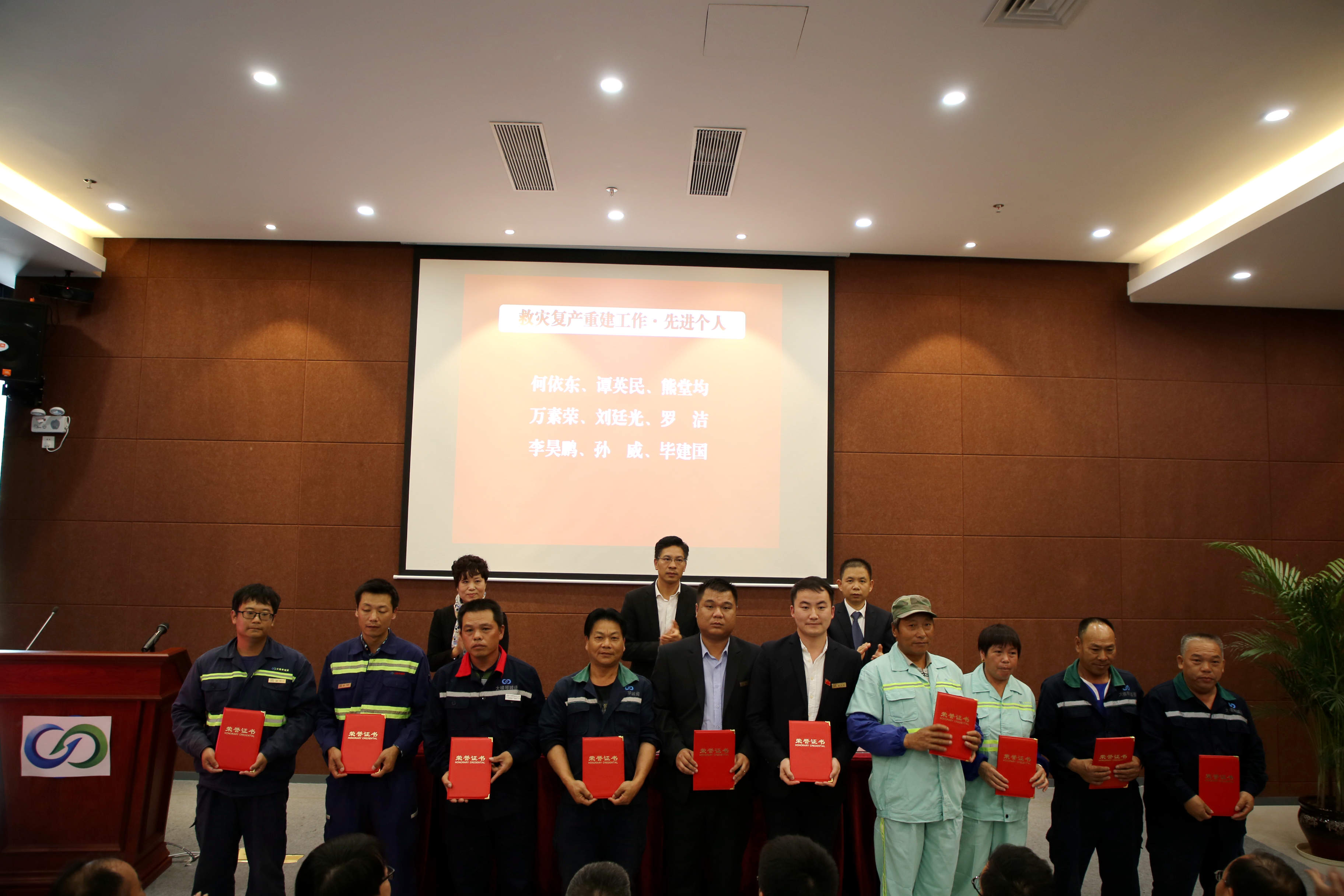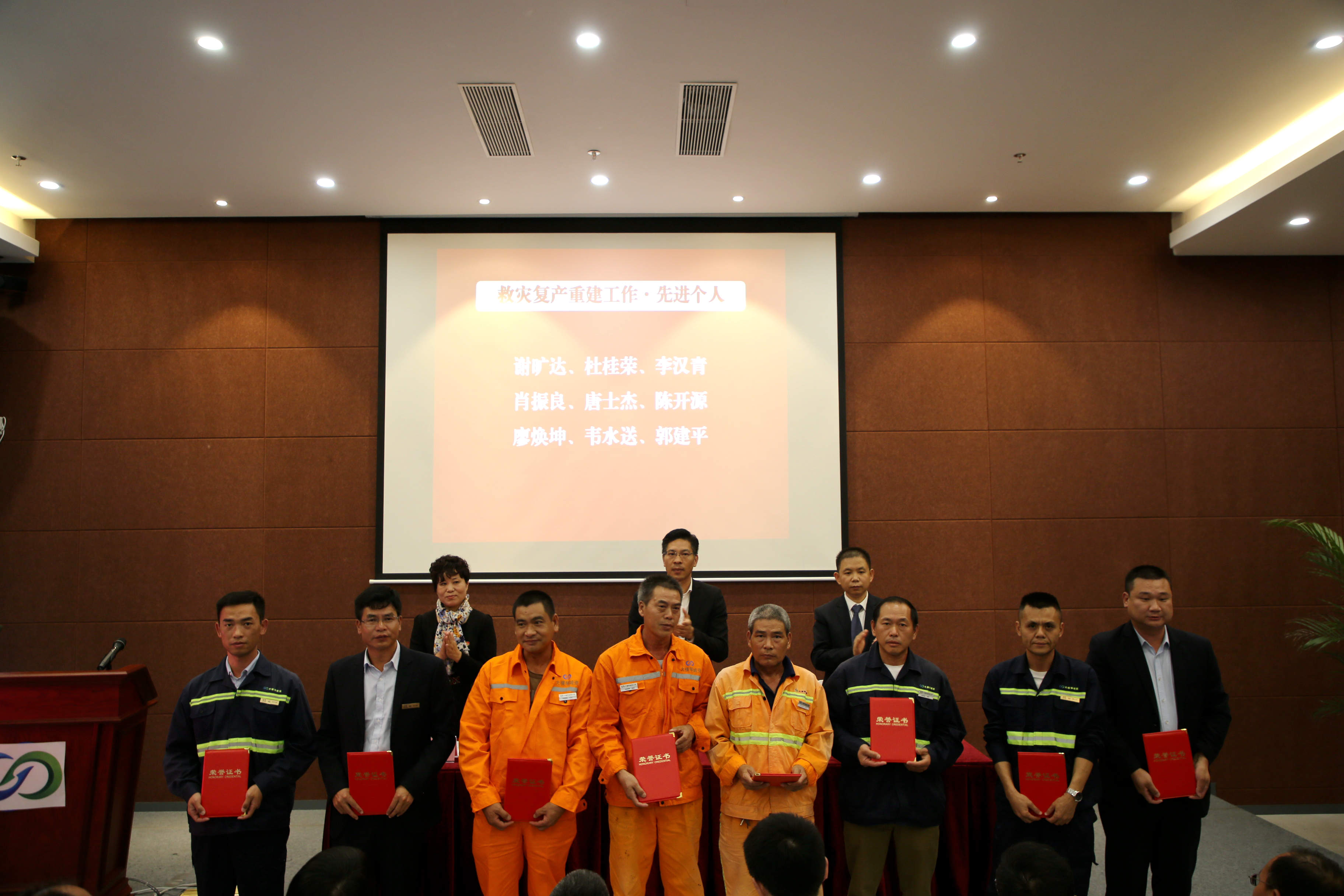 大會以播放救災復產工作影像資料拉開了序幕。隨著音樂的響起,我們仿佛又回到了那段一起并肩作戰的日子,每一個場景、每一個投身作業的身影都歷歷在目。當影像播完,我們都已淚濕雙目。