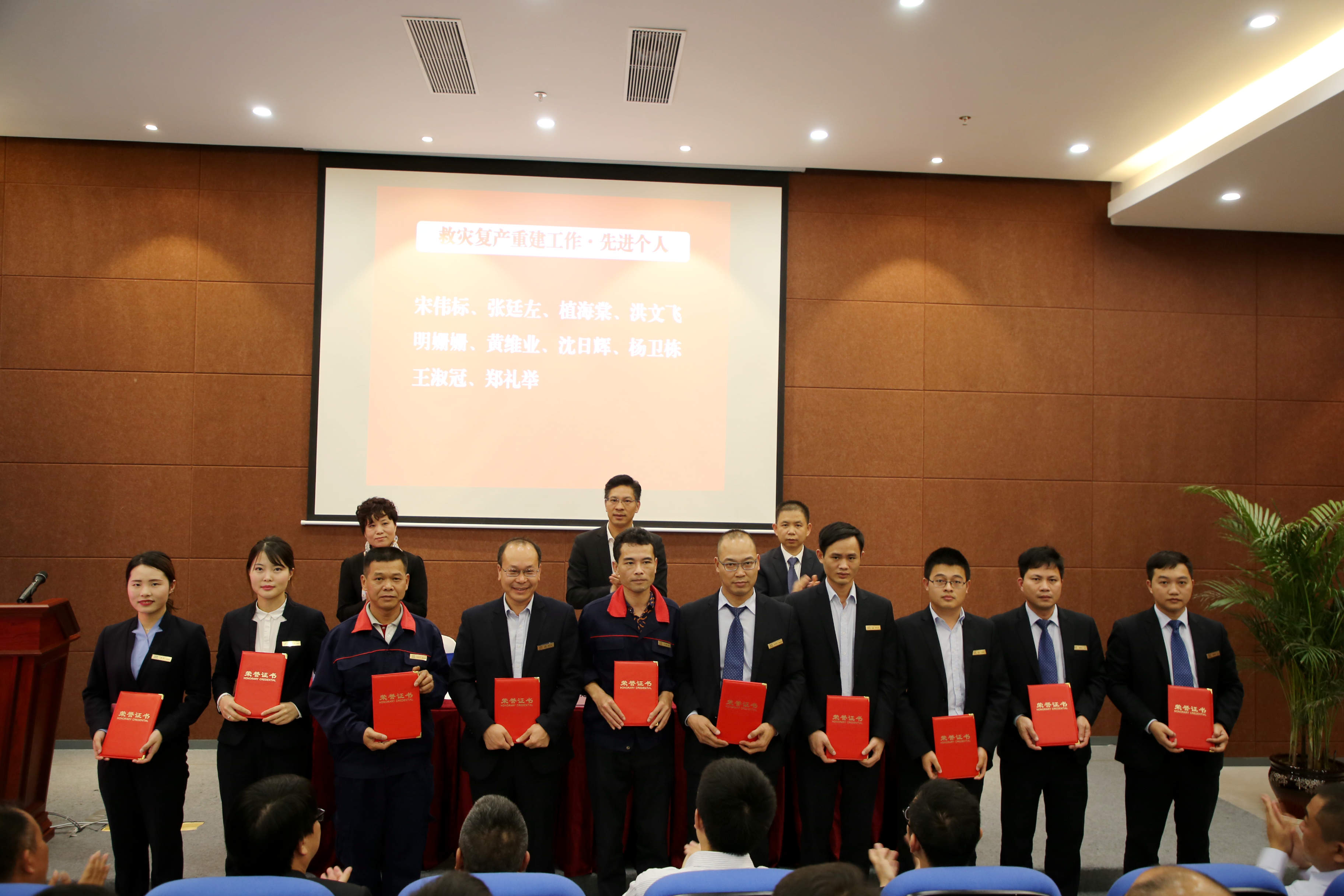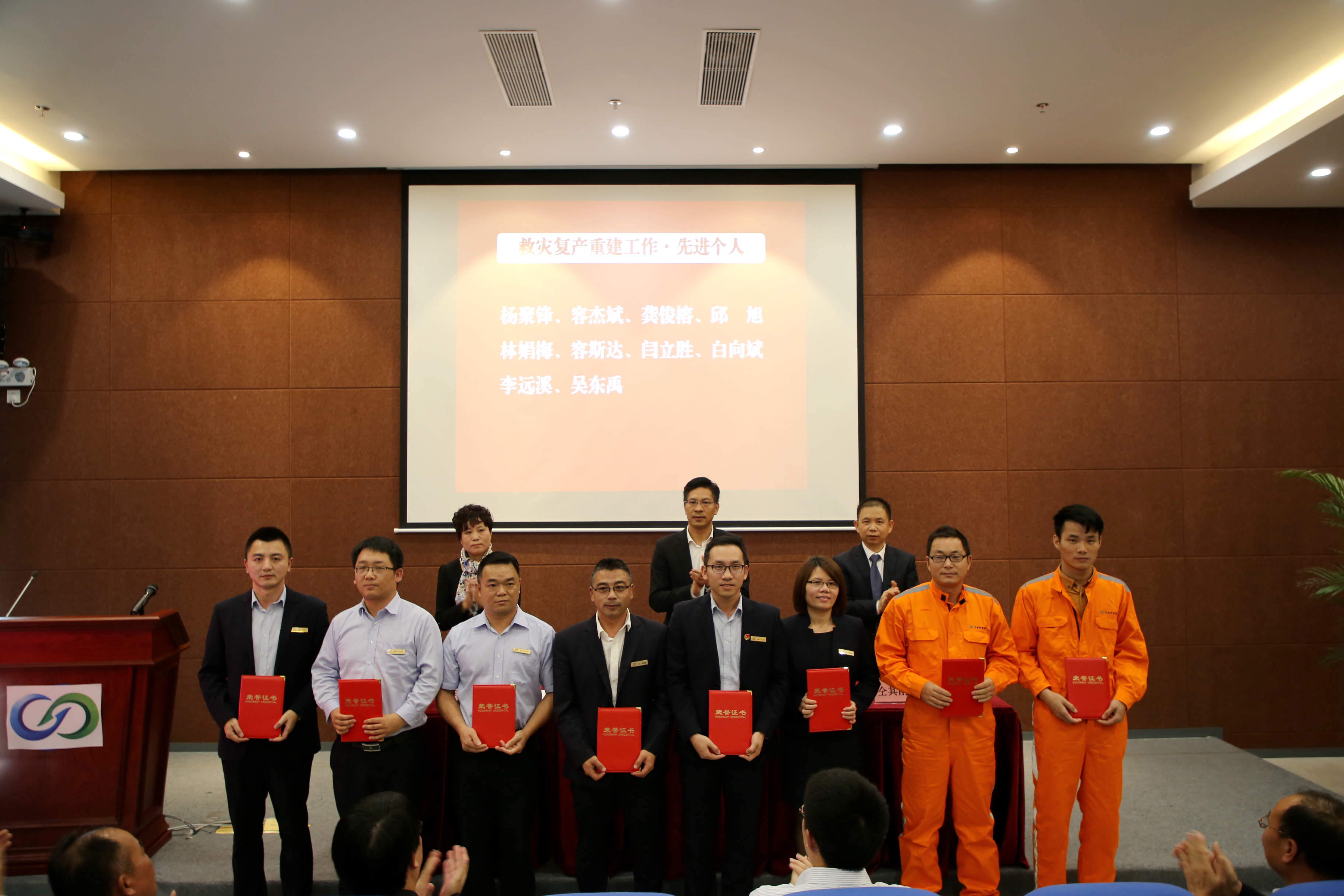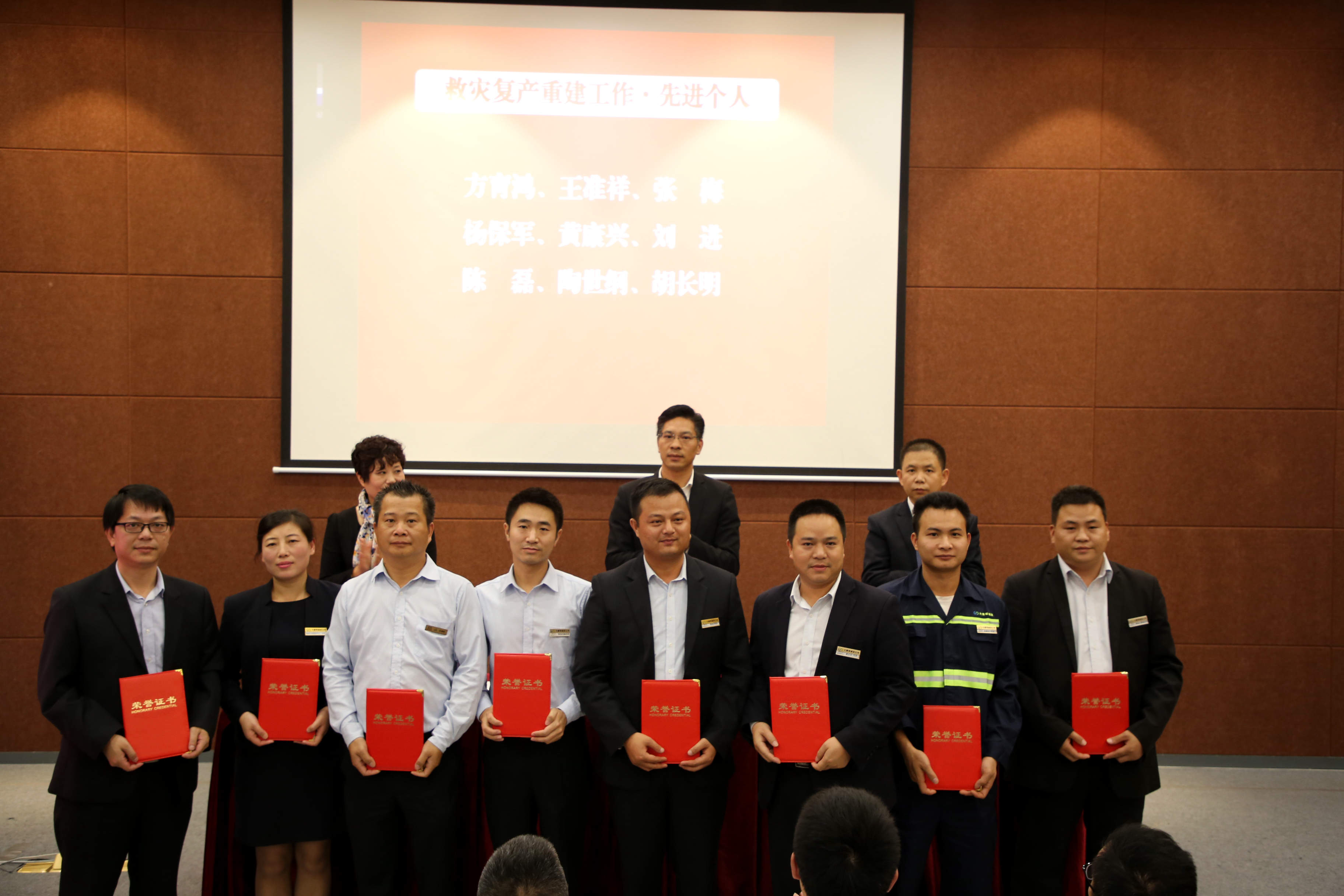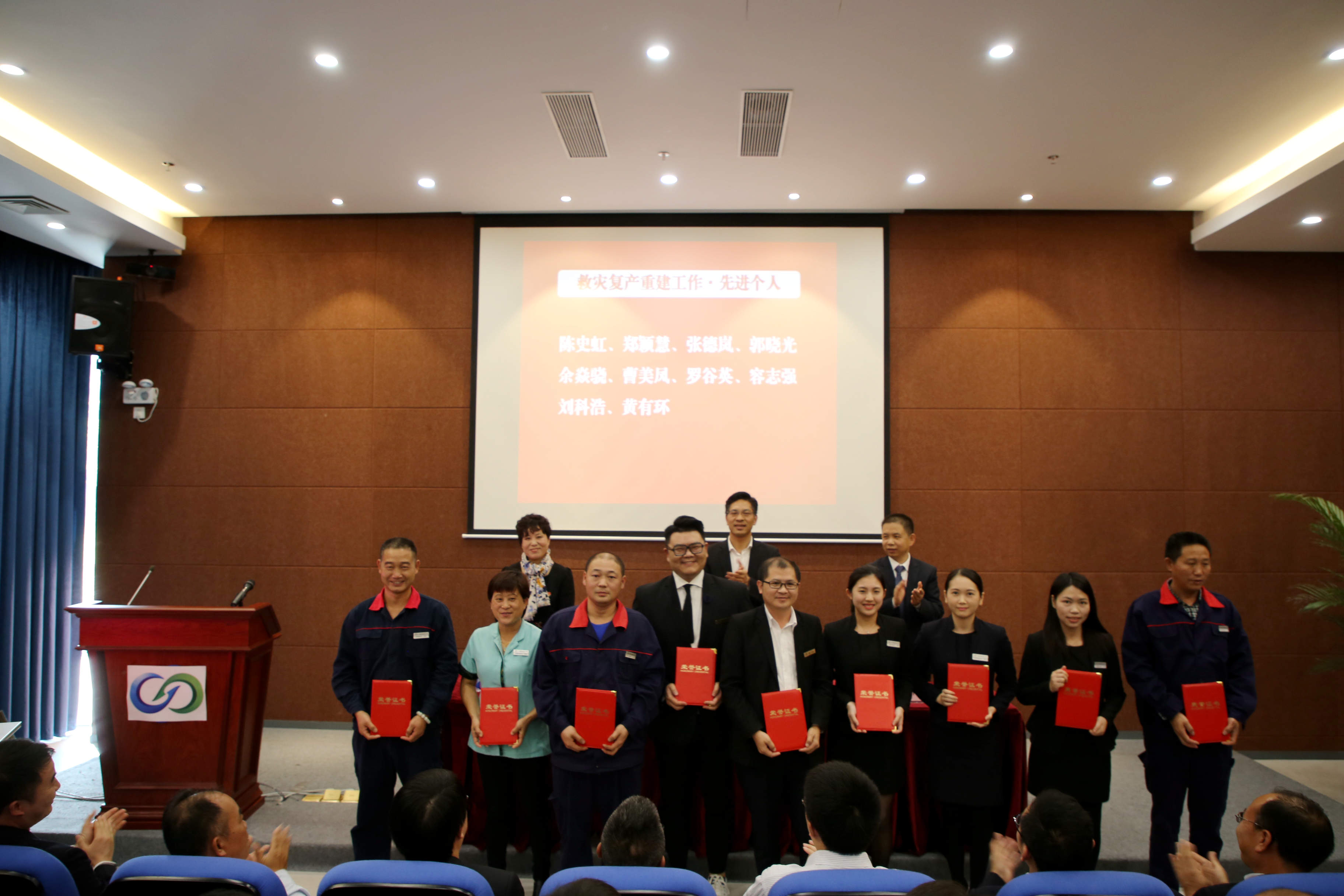 大會以播放救災復產工作影像資料拉開了序幕。隨著音樂的響起,我們仿佛又回到了那段一起并肩作戰的日子,每一個場景、每一個投身作業的身影都歷歷在目。當影像播完,我們都已淚濕雙目。