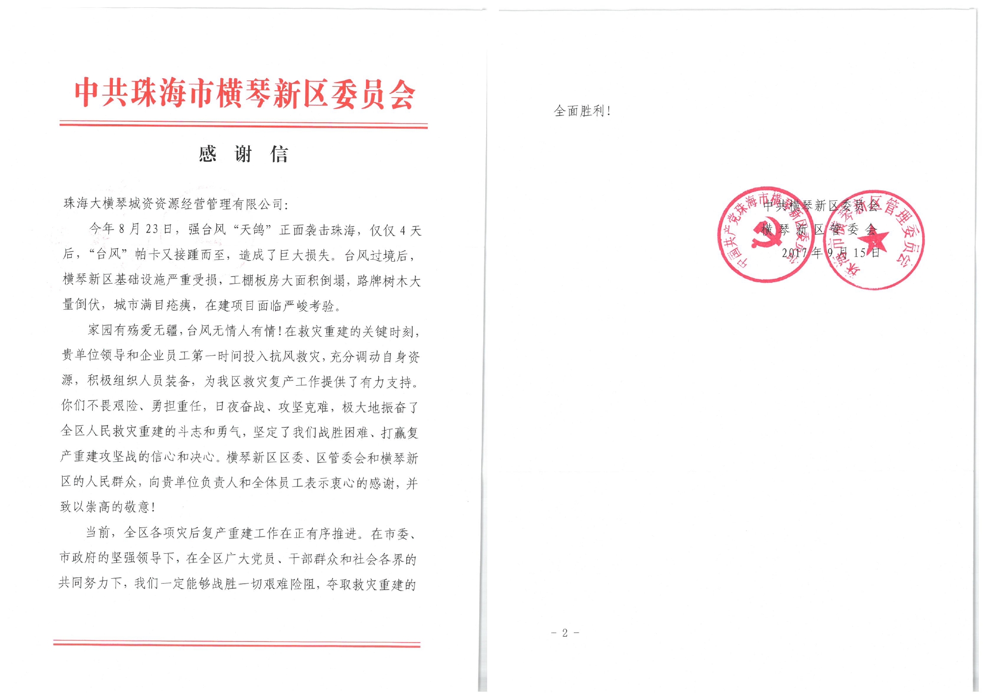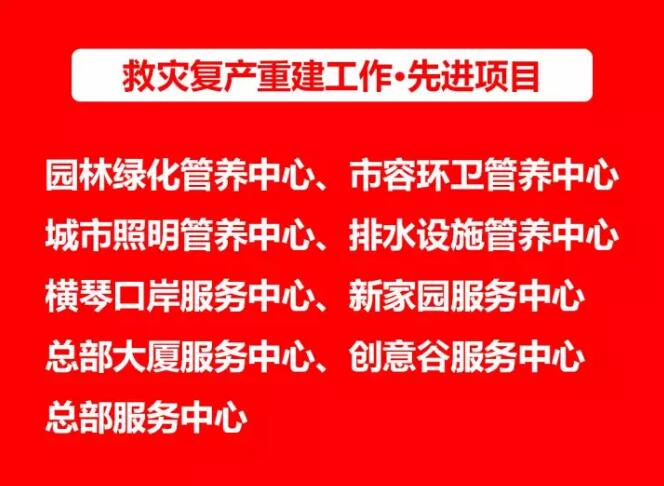 同時需要特別指出的是大橫琴城資公司以頑強拼搏、不畏艱難的精神完成了一個又一個救災復產的任務,得到有關部門的認可,并收到多個單位的致信感謝和贈送錦旗。