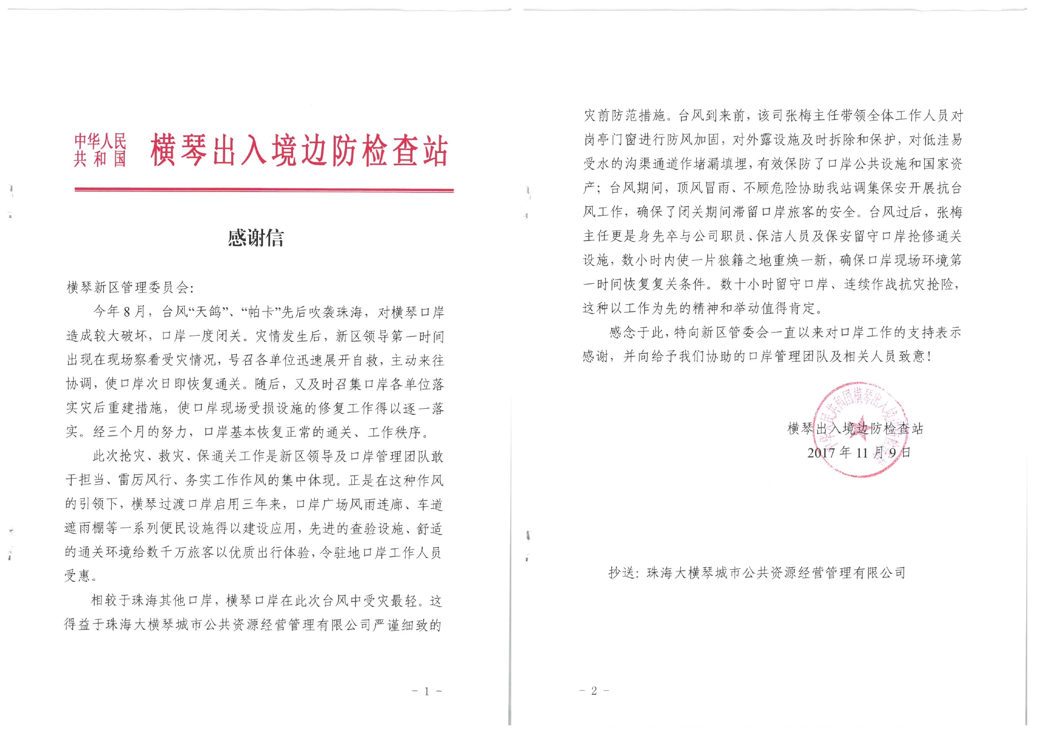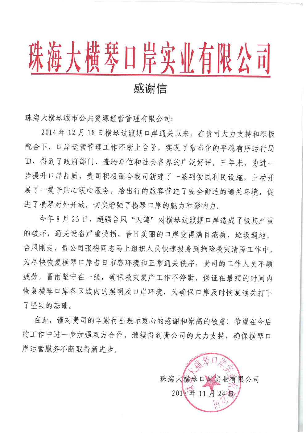 我司收到珠海大橫琴口岸實業公司的感謝信。