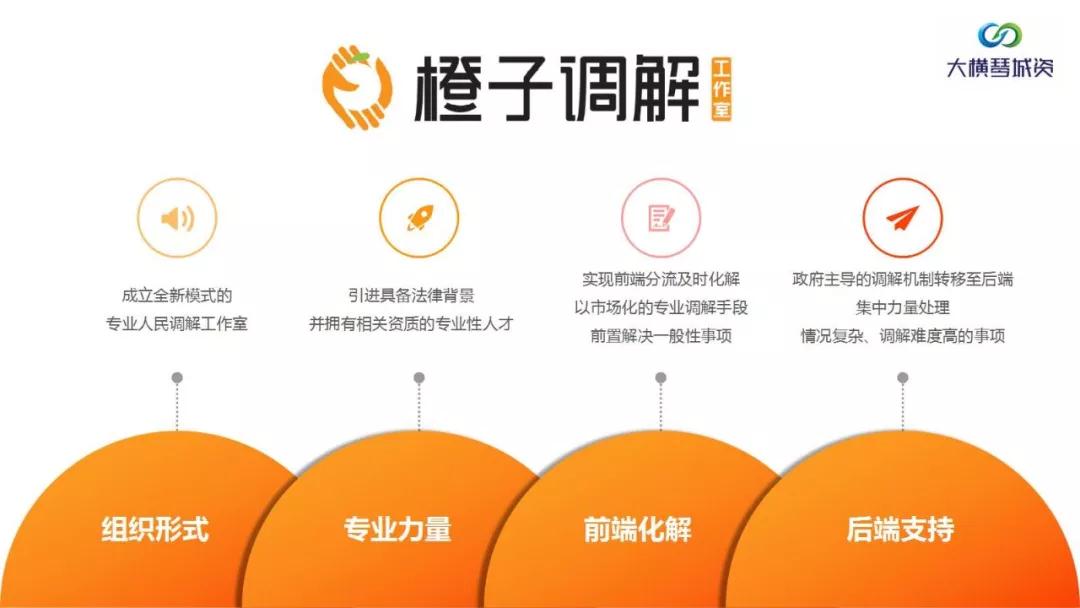 全新模式下,由新成立的橙子調(diào)解工作室作為專業(yè)機構(gòu)前期介入各類調(diào)解,引進具備法律背景并擁有相關(guān)資質(zhì)的專業(yè)性人才,充當好政府線上線下的“客服”角色。同時實現(xiàn)前端分流及時化解,以市場化的專業(yè)調(diào)解手段前置解決一般性事項,可調(diào)解服務(wù)的事項包括但不僅限于勞資糾紛、鄰里糾紛、涉港澳人士糾紛、醫(yī)患糾紛、婦女關(guān)愛調(diào)解、家庭矛盾疏導(dǎo)、心理咨詢服務(wù)等;同時,原政府主導(dǎo)的調(diào)解機制轉(zhuǎn)移至后端,集中力量專門處理情況復(fù)雜、訴求難以解決的調(diào)解事項。
