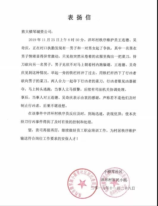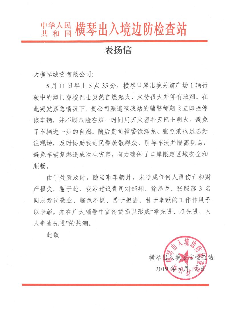 橫琴出入境邊防檢查站特發來表揚信一封,贊揚三名輔警愛崗敬業、臨危不懼、勇于擔當、甘于奉獻的精神。而早在今年一月份時,大橫琴城資的輔警陳鵬昊也曾因為出色的工作表現收到表揚信。