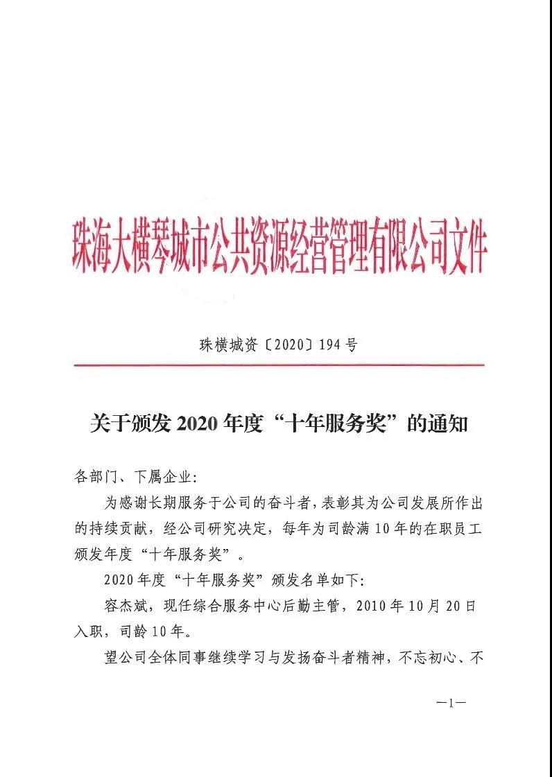 大橫琴城資為容杰斌頒發2020年度“十年服務獎”