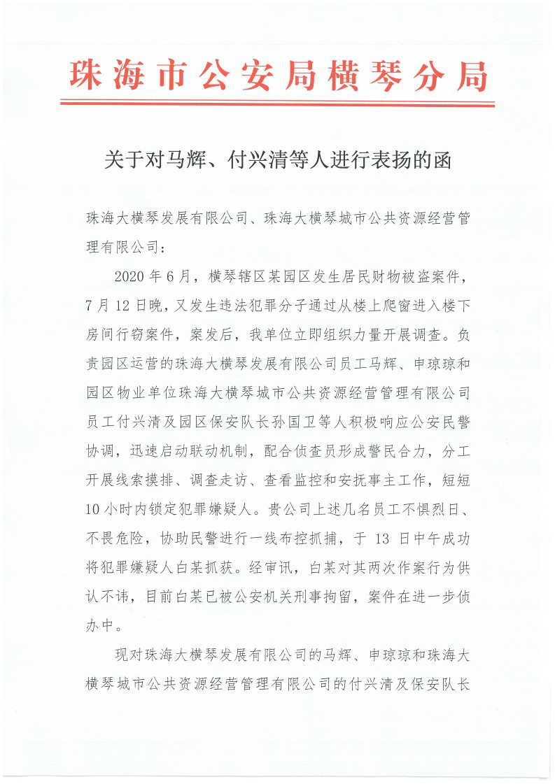 珠海市公安局橫琴派出所對馬輝、申瓊瓊、付興清、孫國衛等人勇敢無畏地協助公安機關偵破案件的行為提出表揚。