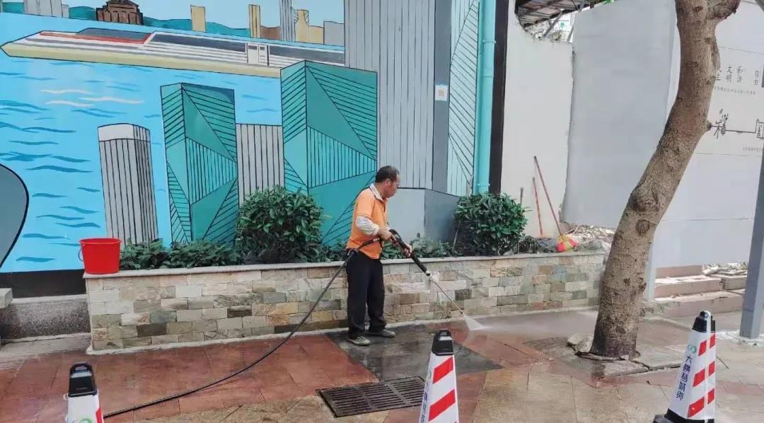 早上6點,“刷刷”的掃帚聲劃破清晨的寧靜,島上的環衛工人們早早開始每天第一次清掃保潔工作,重點對路面污漬青苔、垃圾桶周邊的油漬污垢進行高壓沖洗,對道路及廣場進行沖洗降塵,清理雨水井內垃圾落葉、邊溝及雜草。