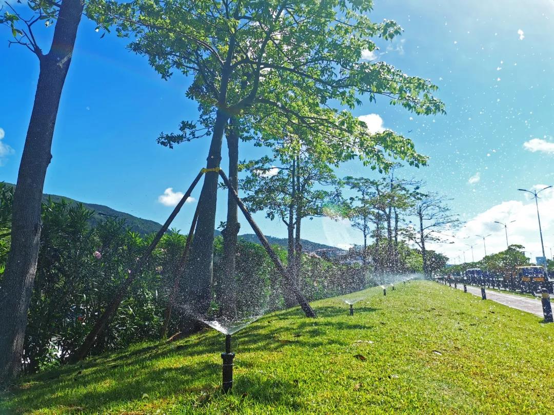 自2021年5月起,大橫琴城資的工作人員便積極投入到鋪設噴淋系統的籌備工作中,先是使用專業探測設備,對原有的給水設施的開關、噴頭、漏水爆管等進行排查和針對性維修,確保正常使用;其次,對部分下沉至草皮下的噴頭進行扶正、提高;再次,調整綠化噴灑角度和交叉噴淋幅度,擴大噴淋系統的覆蓋面積,打造最佳的噴淋效果;最后,對被破壞的草皮進行修復,精心呵護每一片綠意。