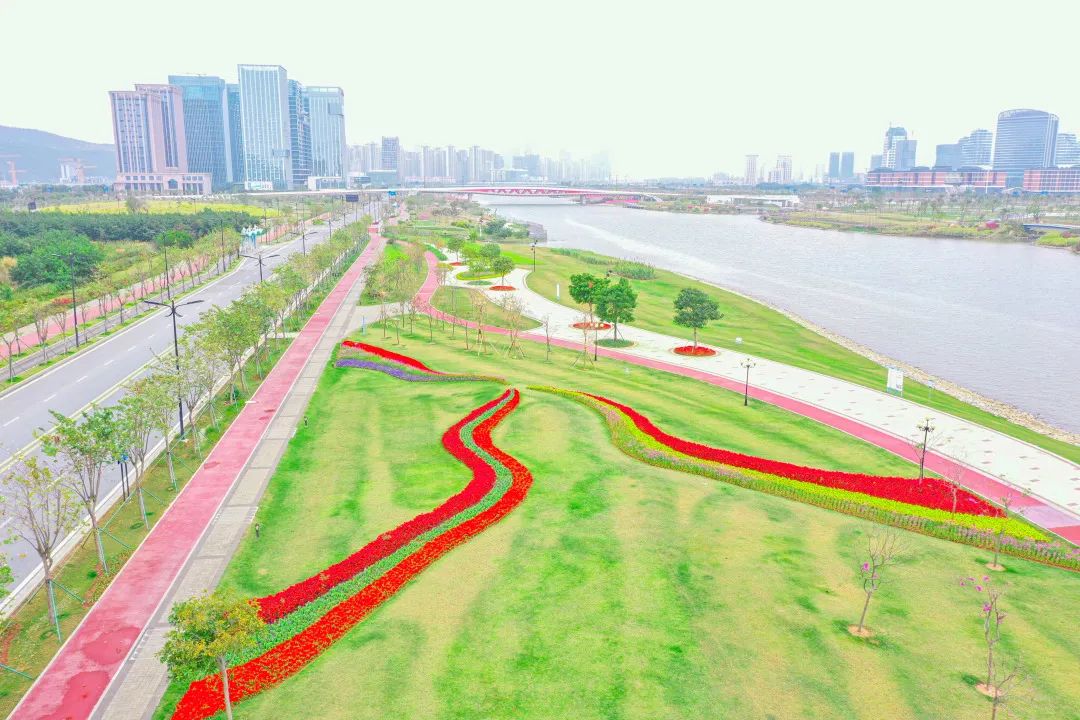 選取紅、綠、紫等多種顏色搭配,通過流線型分區種植,打造出形似流水的多彩色帶,與天沐河充滿活力的生態城市濱水景觀帶形象相得益彰。