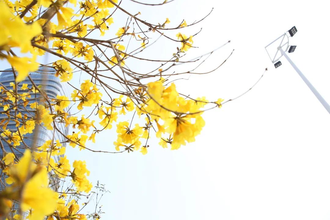 黃花風鈴木每年春季就變色,是一種南方特色苗木。一陣微風拂來,一朵朵金黃色的花朵猶如一簇簇火焰在躍動,格外明艷動人。