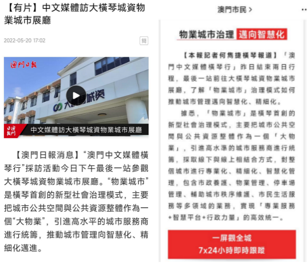 恰逢廣東省第十三次黨代會召開之際,一篇題為《感恩奮進這五年|打造市域社會治理現代化的“廣東樣板”》登上南方網評。作者將“橫琴粵澳深度合作區首創‘物業城市’社會治理新模式,推動社會治理由‘政府全包’向政府、企業、社會三駕馬車‘共建共治共享’模式轉變”列入南粵大地市域社會治理“好點子”之一。