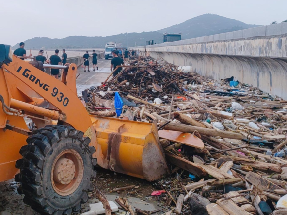 受臺風影響,大量漂浮垃圾隨潮水漲落,工作人員協助清理海堤上的垃圾