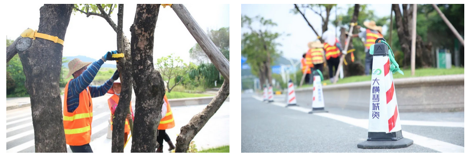 ▲工作人員提前疏枝和修剪樹木,并對道路兩旁重點苗木進行加固處理
