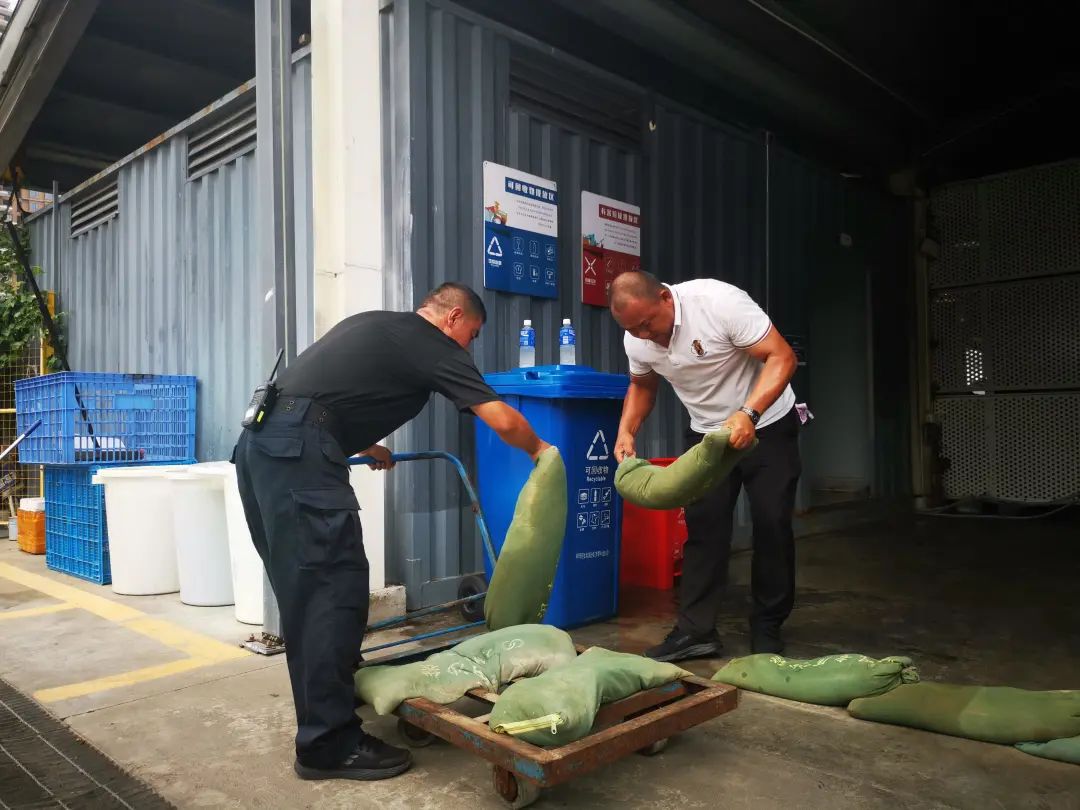 ▲對管轄區(qū)域內(nèi)的集裝箱、保安亭、空調(diào)主機等進行加固,綁緊門窗,堆放沙袋
